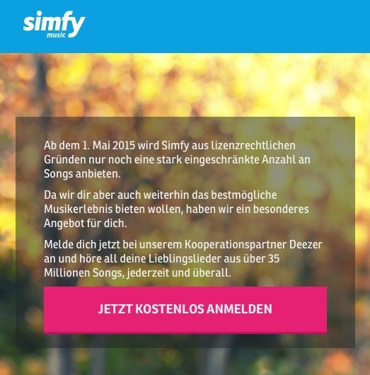 Nutzer von simfy, die auf ihr Angebot zugreifen wollen, finden nur noch eine sehr karge Auswahl an Songs auf ihren zuvor gespeicherten Abspiel-Listen. Dies hat, so teilt Simfy auf seiner Homepage mit, „lizenzrechtliche Gründe“. Seit dem 1. Mai 2015 gibt es nur noch ein sehr stark eingeschränktes Angebot. Man empfiehlt Freunden der Musik den Wechsel zu Deezer.